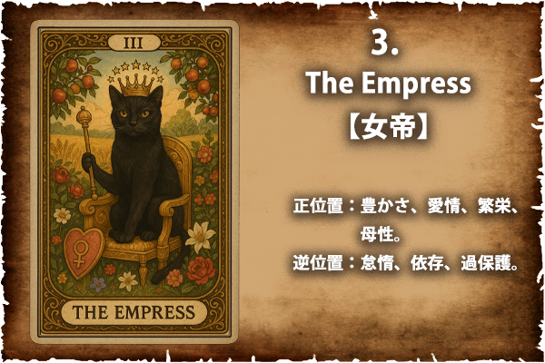 女帝のカードは、無条件の愛と豊かさの象徴です。正位置では「受け取り、与える」サイクルを広げ、逆位置では「愛や豊かさを独り占めしていないか」を見直すきっかけを与えます。