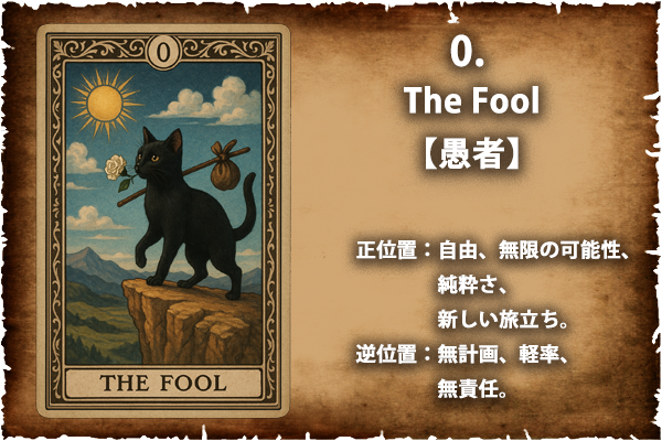 愚者は大アルカナの「0番」に位置する特別なカードです。0という数字は「始まりも終わりもない無限」を表し、自由・無垢・無限の可能性を示しています。他のどのカードにも縛られない存在であり、人生における新しい冒険の象徴です。